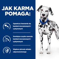 HILL'S PD Prescription Diet Canine u/d Urinary Care została odpowiednio skomponowana, aby wspomóc walkę z kamieniami nerkowymi u Twojego psa, i wspomóc prace nerek. Dlatego zostało w nim obniżone wartości białkowe, białkowe, które mogłoby dodatkowo obciążać nerki. Zmniejszona ilość fosforu i sodu, – które ograniczają resorpcję wody w organizmie i tym samym zapobiega przed wczesnymi chorobami serca. Zmniejszona ilość miedzi w karmie chroni organizm przed zatruciem miedzią, której chory pies nie jest w stanie szybko katabolizować.