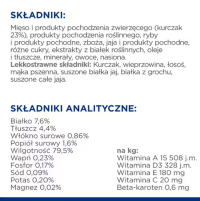 Ta soczysta karma mokra z drobnymi kawałkami w sosie zawiera 25% kurczaka i inne łatwo przyswajalne składniki, takie jak łososia czy białko z grochu. Wszystkie składniki łączą się, tworząc pełnowartościowy posiłek i pomagają zrównoważyć zaburzone procesy trawienne. Pokarm zawiera zrównoważoną mieszankę witamin, minerałów, pierwiastków śladowych i beta-karotenu. W ten sposób twój kot osiągnie dobrostan, a jego układ odpornościowy zostanie wzmocniony.