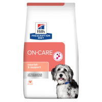 Hill’s Prescription Diet ON-Care to kompletna karma sucha opracowana specjalnie dla psów potrzebujących dodatkowego wsparcia żywieniowego w czasie poważnych chorób. Formuła została stworzona przez lekarzy weterynarii i specjalistów żywienia, aby wspomagać utrzymanie sił, energii i apetytu. Karma zawiera kurczaka (12%), lekkostrawne białko i aromatyczne tłuszcze, dzięki czemu jest wyjątkowo smakowita i chętnie jedzona przez psy nawet w okresie obniżonego łaknienia.