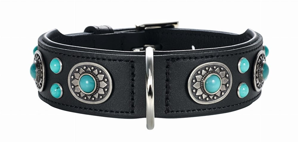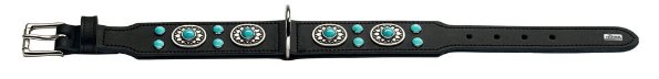 Cztery metalowe medaliony rozmieszone na całej długości obroży posiadają tłoczenia w gwiazdy. Prócz tego w każdym medalionie (oraz pomiędzy nimi) osadzone są kamienie - turkusy. Dzięki zastosowaniu czarnej skóry dekoracje wyglądają niezwykle szykownie i gustownie. Mimo bogatego zdobienia obroża jest bardzo wygodna i żaden z odstających elementów nie będzie psu przeszkadzał nawet podczas zwyczajnych czynności. Obroża nadaje się na specjalne wyjścia i spotkania z przyjaciółmi.