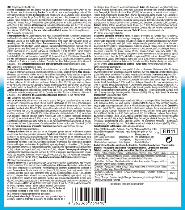 Tuńczyk o smaku owoców morza: Tuńczyk (30,0%), Tapioka (suszona), Ekstrakt z tuńczyka (0,5%), Ekstrakt z przegrzebka (0,3%), Ekstrakt z kraba (0,3%), Kolagen