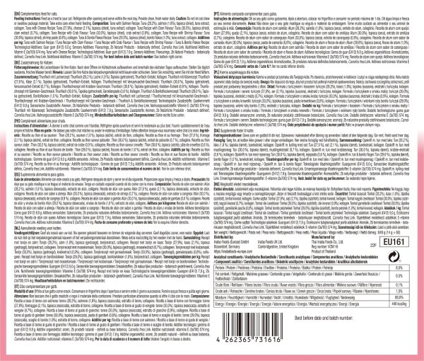 Tuńczyk i ser: Tuńczyk (27,9%), Ser (2,1%), Tapioka (suszona), Ekstrakt z tuńczyka, Kolagen