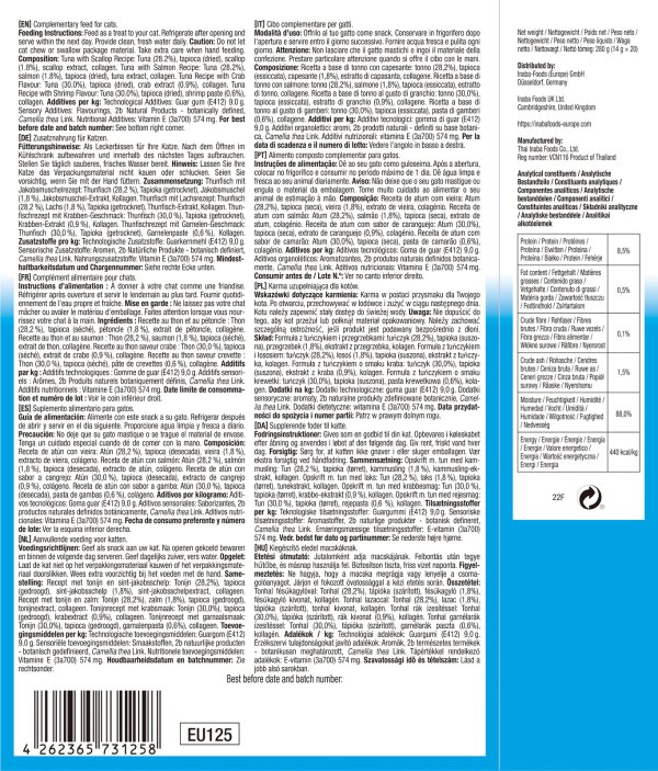 Tuńczyk i przegrzebki: Tuńczyk (28,2%), Tapioka (suszona), Przegrzebek (1,8%), Ekstrakt z przegrzebka, Kolagen