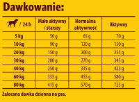 Dostosować ilość karmy do wieku, wagi i poziomu aktywności psa. Zapewnić dostęp do świeżej wody.