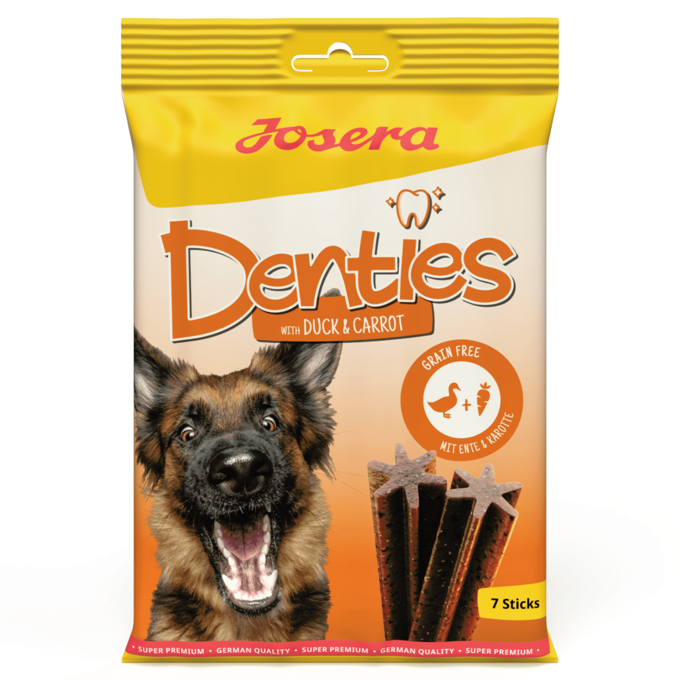 Josera Denties to smaczny i zdrowy gryzak dentystyczny, który pomaga w pielęgnacji zębów Twojego psa. Jego specjalna struktura oraz kształt przypominający gwiazdkę skutecznie masują dziąsła, wspomagając higienę jamy ustnej. Zawartość celulozy w gryzakach zapewnia przyjemne żucie i efektywnie pomaga w utrzymaniu czystości zębów. Pyszna kaczka i marchewka zapewniają niezrównany smak, sprawiając, że mycie zębów staje się ulubionym zajęciem psa.