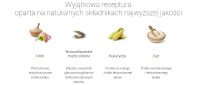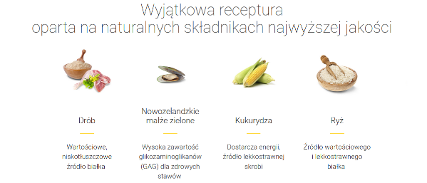Składniki główne: Suszone białko drobiowe, kukurydza pełnoziarnista, ryż, wysłodki buraczane, tłuszcz drobiowy, hydrolizowane białko drobiowe, olej z łososia (0,80%), minerały, drożdże, suszony korzeń cykorii (naturalne źródło inuliny), suszone mięso nowozelandzkich małż (Perna canaliculus).