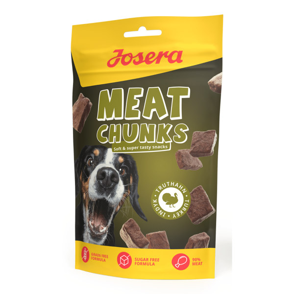 Josera Meat Chunks z indykiem to wyjątkowo smaczne, delikatnie suszone przysmaki dla psów, które łączą intensywny aromat mięsa z najwyższą jakością składników. Wykonane w 90% z mięsa (w tym 30% z indyka), stanowią doskonałą nagrodę lub przekąskę między posiłkami.