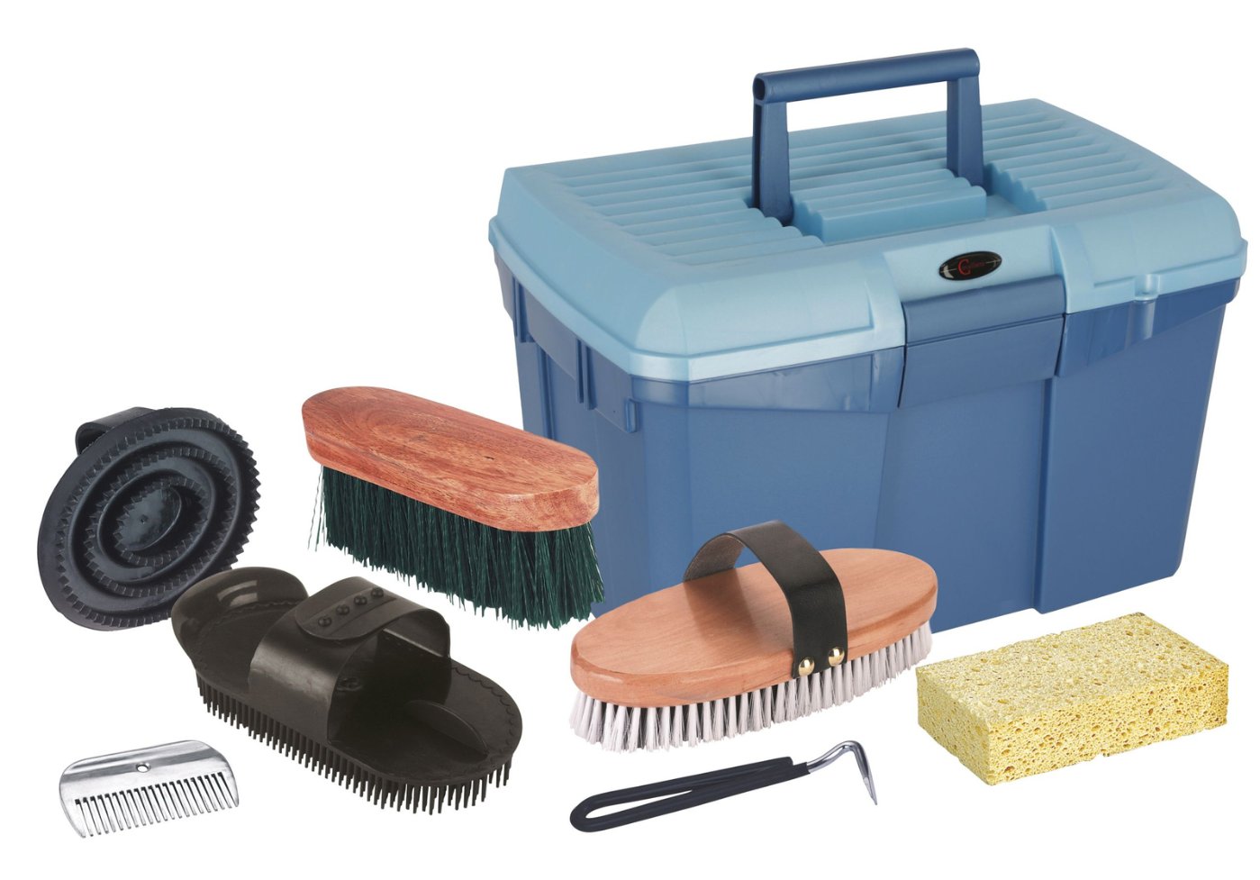 Przesyłka obejmuje skrzynkę, owalne zgrzebło, kopystkę, wiskozową gąbkę, standardową małą szczotkę do grzywy, plastikowe zgrzebło, szczotkę i grzebień.