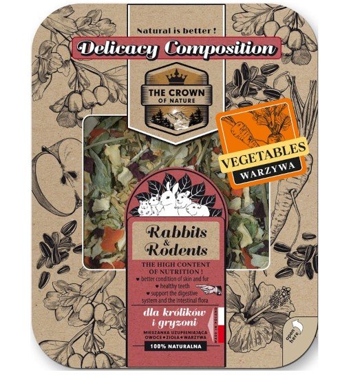 KORONA NATURY Delicja Warzywna to naturalny przysmak dla gryzoni i królików o aromacie suszonych warzyw, który przenosi pupila do ogrodu pełnego smakołyków. Produkt dostarcza wartościowych składników odżywczych i błonnika, wspierając prawidłowe funkcjonowanie układu pokarmowego, a jednocześnie stymuluje apetyt i ciekawość zwierzęcia. Smaczny, zdrowy i w pełni naturalny, nie zawiera dodatku konserwantów, dzięki czemu jest bezpieczny i idealny do podawania między posiłkami.