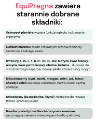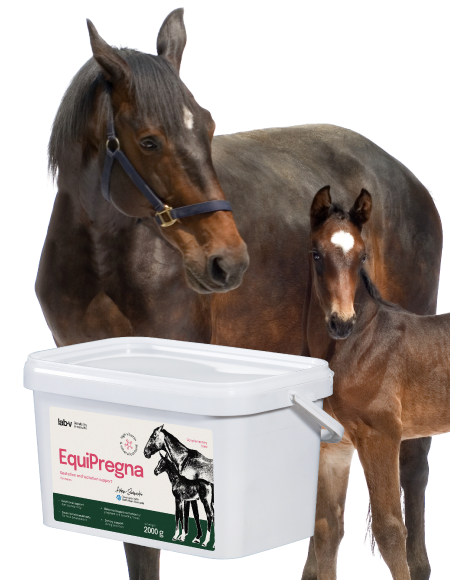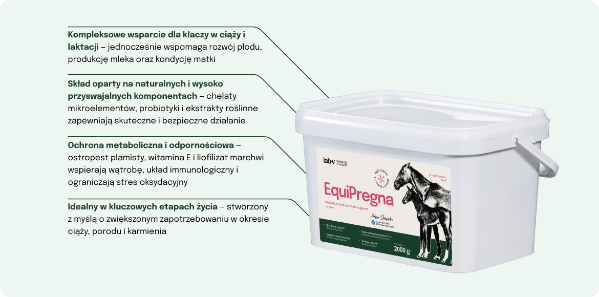 Lab-v EquiPregna to specjalistyczna mieszanka paszowa uzupełniająca opracowana przez lekarzy weterynarii, stworzona z myślą o klaczach ciężarnych i karmiących. Produkt wspiera prawidłowy przebieg ciąży, rozwój płodu oraz produkcję mleka, dostarczając niezbędne witaminy, mikroelementy, aminokwasy oraz ekstrakty roślinne. Dzięki zastosowaniu składników takich jak ostropest plamisty, witamina E oraz probiotyki, preparat wspomaga metabolizm i odporność klaczy, a także poprawia jakość mleka.