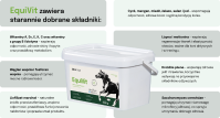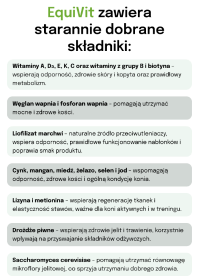 W skład EquiVit wchodzą łatwo przyswajalne mikroelementy w formie chelatów, które wspierają zdrowe kości, stawy i mięśnie. Liofilizowana marchew, bogata w naturalne karoteny i antyoksydanty, wspomaga ochronę komórek przed stresem oksydacyjnym, poprawiając ogólną kondycję i wygląd zwierzęcia. Zawarte w mieszance drożdże probiotyczne korzystnie wpływają na florę jelitową, co przekłada się na lepsze trawienie i wchłanianie składników odżywczych.