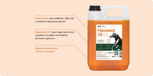 Lab-v Flaxseed Oil to naturalny suplement, który wspiera zdrowie koni na każdym etapie życia i treningu, zapewniając im energię, odporność oraz piękną sierść.