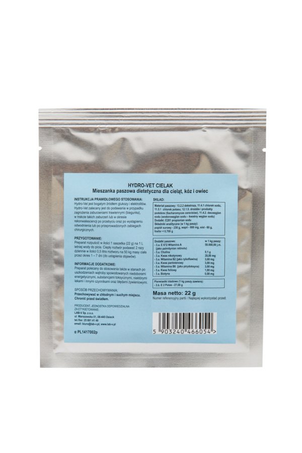 Lab-v Hydro-Vet Cielak to dietetyczna mieszanka paszowa, stworzona specjalnie dla cieląt, kóz i owiec, wspomagająca regenerację organizmu po operacjach, biegunce i odwodnieniu. Produkt wspiera równowagę wodno-elektrolitową, regenerację przewodu pokarmowego oraz przywraca równowagę mikroflory jelitowej.