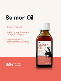 Lab-v Salmon Oil to 100% naturalny olej z łososia atlantyckiego, stanowiący bogate źródło nienasyconych kwasów tłuszczowych omega-3 i omega-6, niezbędnych w codziennej diecie zwierząt. Regularne stosowanie wspiera zdrowie skóry i sierści, pracę serca, układ immunologiczny, a także sprawność stawów.