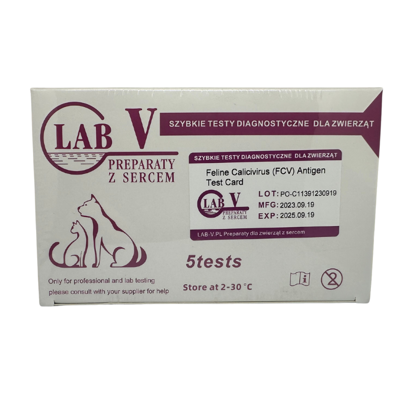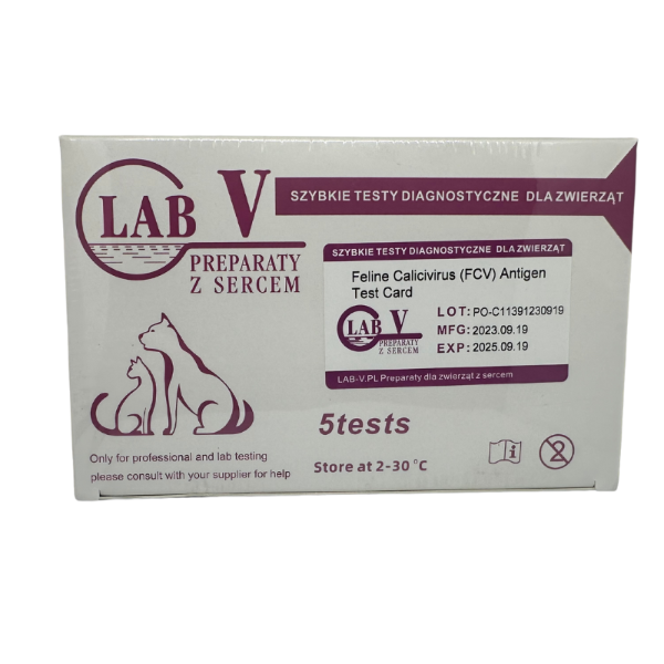 Lab-V FCV Ag to szybki test immunochromatograficzny przeznaczony do jakościowego wykrywania antygenu wirusa kaliciwirozy w próbkach pobranych od kotów. Umożliwia szybką diagnozę infekcji dróg oddechowych wywołanych przez FCV, co pozwala na podjęcie natychmiastowych działań terapeutycznych i ograniczenie rozprzestrzeniania choroby.