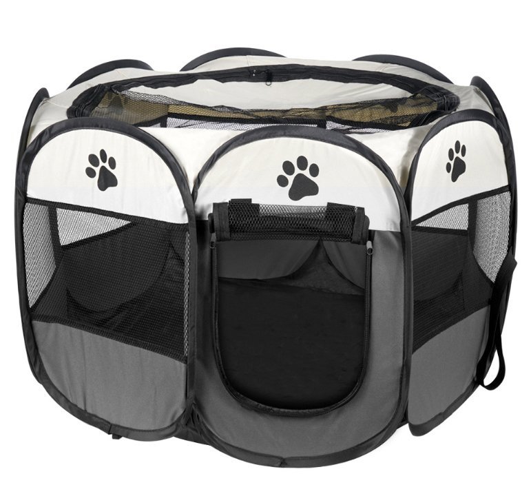 Składany, tekstylny kojec wykonany na planie ośmiokąta przeznaczony dla psów, szczeniąt, kotów oraz niewielkich zwierząt. Kojec jest idealnym rozwiązaniem dla właścicieli zwierząt, szczególnie gdy zajdzie potrzeba wydzielenia swoim pupilom bezpiecznej przestrzeni. Produkt nadaję się do użycia zarówno w domu jak i w plenerze.