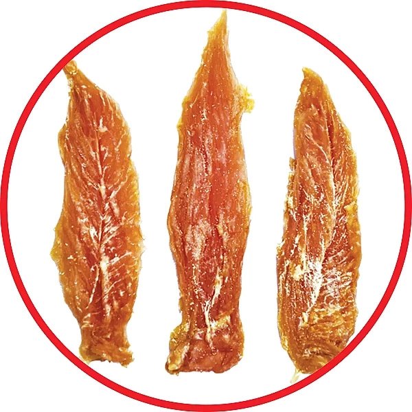 FILETY Z PIERSI KURCZAKA dla psów (karma uzupełniająca), wyprodukowane poprzez suszenie 100% świeżego mięsa kurczaka. Przechowywać w temp. poniżej 20°C i wilgotności względnej powietrza do 60%. Chronić przed bezpośrednim promieniowaniem słonecznym. Po otwarciu opakowania można przechowywać w lodówce. Produkt nie do spożycia przez ludzi.