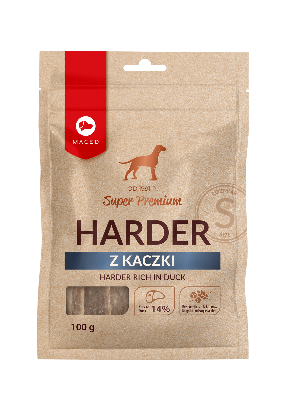 MACED Harder z Kaczki - S to twardy, naturalny gryzak, który skutecznie wspomaga usuwanie kamienia nazębnego i dba o higienę jamy ustnej psa. Produkt wykonany jest w 96% z mięsa i produktów pochodzenia zwierzęcego (w tym 14% kaczki), z dodatkiem produktów roślinnych i minerałów.