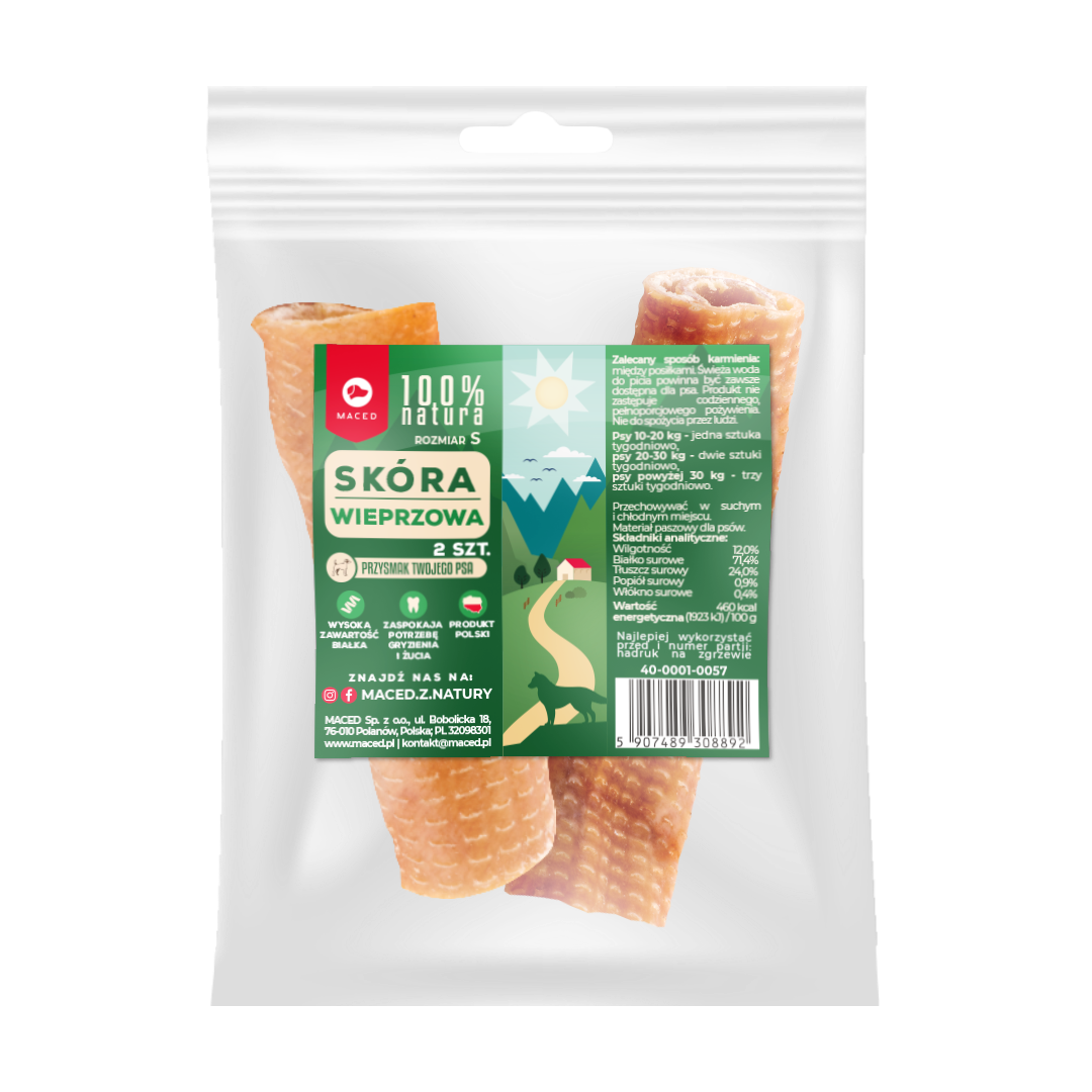 MACED Skóra wieprzowa S to w 100% naturalny przysmak dla psów, który nie zawiera sztucznych aromatów, konserwantów ani barwników. Suszenie skóry pozwala zachować wartości odżywcze i naturalny mięsny aromat, który zachęca psa do gryzienia.