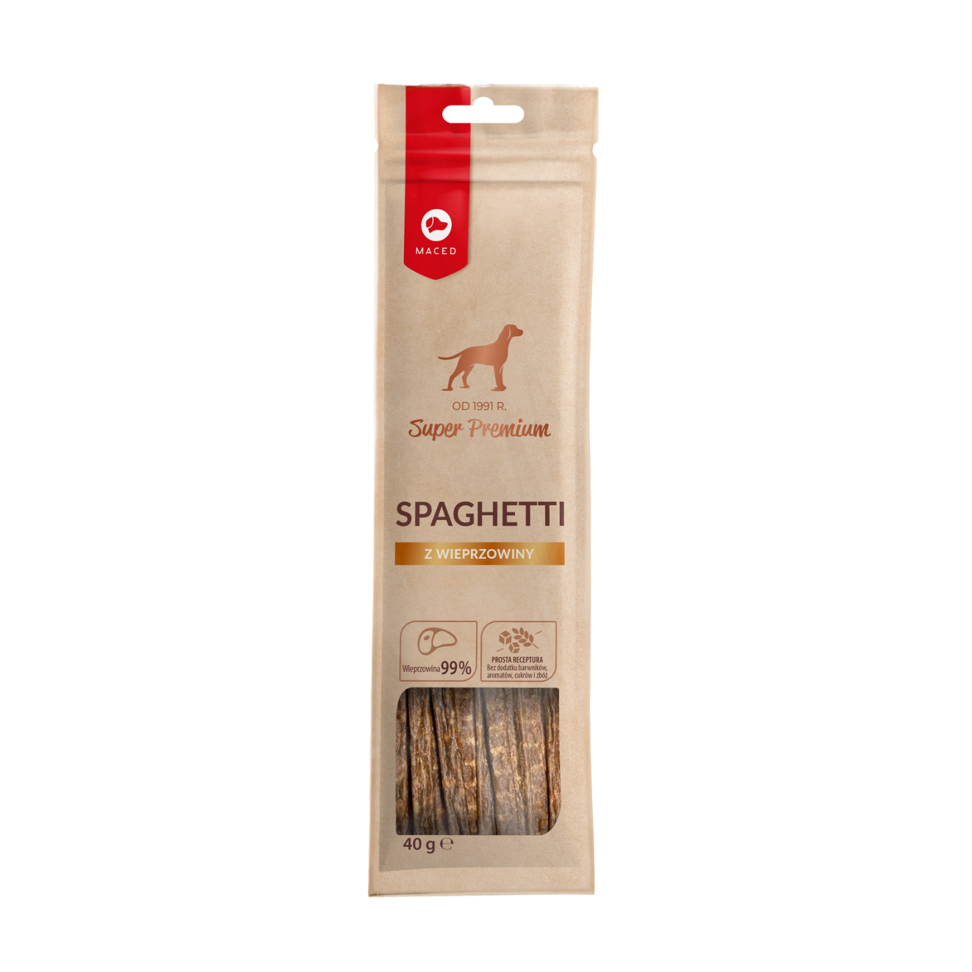 MACED Spaghetti z wieprzowiną to pyszne i łatwo przyswajalne przysmaki treningowe, które pomagają wzmocnić dobre zachowania psa. Smakowite spaghetti może być stosowane jako nagroda podczas treningu, a także jako sposób na okazanie psu troski i uwagi.