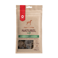 Przysmak Naturel Soft to produkt monoproteinowy, zawierający aż 91% wołowiny, które jest jedynym źródłem białka. Soczyste kawałki mięsa nie zawierają zbóż, a jedynie oregano, które ma działa przeciwbakteryjne, przeciwgrzybiczne, uspokajające oraz korzystnie wpływa na proces trawienia. Mięso wołowe jest źródłem żelaza, cynku. selenu oraz witamin z grupy B.