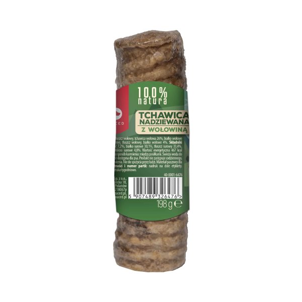 MACED Tchawica Mała z Wołowiną to naturalny gryzak wykonany z tchawicy wołowej (26%) nadziewanej farszem wołowym (4%). Dzięki naturalnym składnikom takim jak płatki pszenne i tłuszcz wołowy, gryzak jest całkowicie wolny od sztucznych dodatków, minimalizując ryzyko alergii i nietolerancji pokarmowych.