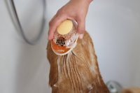 Szczotka kąpielowa umożliwia równomierne rozprowadzenie szamponu lub odżywki na futrze zwierząt, dzięki wbudowanemu przyciskowi dozownika, co ułatwia aplikację podczas szczotkowania.
