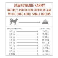 Aby uzyskać najlepsze efekty w redukcji przebarwień, zaleca się podawanie wyłącznie karmy Nature’s Protection Superior Care White Dogs przez minimum 4 tygodnie. Efekty widoczne są stopniowo wraz ze wzrostem nowego, białego włosa. Pies powinien mieć stały dostęp do świeżej wody.