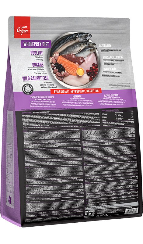 Karma Orijen zapewnia Państwa kotu biologicznie dopasowaną karmę z 85% białka zwierzęcego i 15% warzyw, owoców i roślin. Żadna z receptur nie zawiera zbóż, ziemniaków ani białek roślinnych.