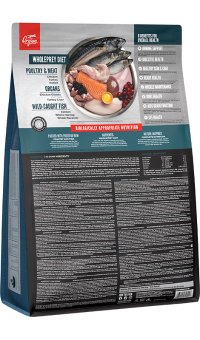 SKŁADNIKI: Świeży kurczak (32%), surowy łosoś (5%), surowy indyk (5%), cały surowy śledź (5%), cała surowa makrela (5%), świeża podroby z kurczaka (wątroba, serce) (4,5%), surowa wątroba indyka (4%), świeże jaja (4%), suszone mięso z kurczaka (4%), suszone mięso indycze (4%), suszone śledzie (4%), suszone wątróbka drobiowa (4%), suszone jaja (4%), surowy królik (4%), cała czerwona soczewica, cała fasola pinto, cała zielona soczewica, cała ciecierzyca, cała fasola granatowa, cały groszek, skrobia grochowa, trawa miskant, dorsz olej (1%), tłuszcz z kurczaka (0,5%), cała świeża dynia, świeża cała dynia maślana, suszone wodorosty, suszony korzeń cykorii, całe świeże jabłka, świeże całe marchewki, świeże całe gruszki, świeża cała cukinia, suszone drożdże piwne, hydrolizowane drożdże, świeże liście buraka, świeża kapusta, świeży szpinak, świeże liście rzepy, cała żurawina, całe jagody, całe jagody, korzeń łopianu, lawenda, korzeń hibiskusa, ostropest plamisty, dzika róża, kurkuma.