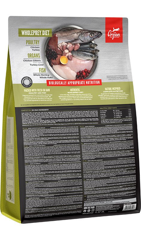 Karma Orijen Senior to przede wszystkim mięso oraz podroby z kurczaka oraz indyka. W przeliczeniu na pełną zawartość ich ilość wynosi ok. 0,85kg (na opakowanie 2kg), na które poza świeżym mięsem składają się serca, wątróbki i szyjki. Kolejne 0,25kg stanowią całe ryby – śledź, flądra oraz sardynki. Warto także podkreślić występowania w składzie całych świeżych jaj. Oczywiście występuje też cała mnogość warzyw oraz owoców posiadających wiele walorów zdrowotnych – tak ważnych w zaawansowanym wieku.