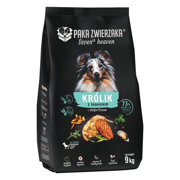 Paka Zwierzaka 9kg Seven’th Heaven Królik z Łososiem to doskonale zbilansowana karma sucha jakości SUPERPREMIUM, pozbawiona zbóż, grochu, kukurydzy, soi, konserwantów i sztucznych barwników. Karma zawiera aż 73% składników pochodzenia zwierzęcego, w tym wysokiej jakości mięso królika i łososia, co zapewnia psu wysoką smakowitość i łatwą przyswajalność.