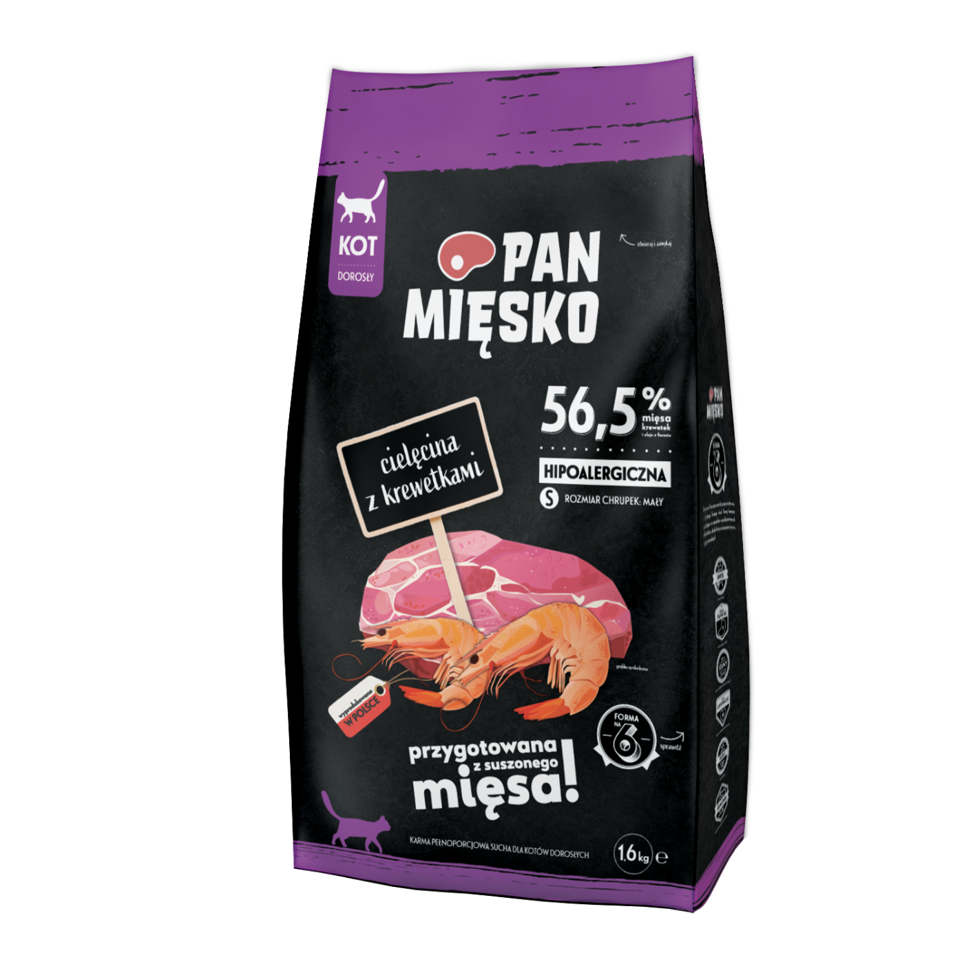 Hypoalergiczna karma sucha przeznaczona dla kotów dorosłych. Pan Mięsko to karma wyprodukowana w Polsce, która przygotowana jest ze starannie wyselekcjonowanego, suszonego mięsa oraz dodatków w postaci polskich jabłek, warzyw i składników odżywczych, które zapewnią kotu wszystko, czego potrzebuje. Karma zawiera cielęcinę czyli lekkostrawne mięso o wysokiej zawartości białka i niskiej tłuszczu. Podawanie tego produktu zapewnia dostarczenie niezbędnych witamin do prawidłowego funkcjonowania organizmu. Jest również doskonałym źródłem żelaza. Krewetki natomiast są bogate w sód, potas, żelazo, magnez, cynk, fosfor, fluor, selen, jod, miedź, a nawet kwasy tłuszczowe omega-3 i omega-6.