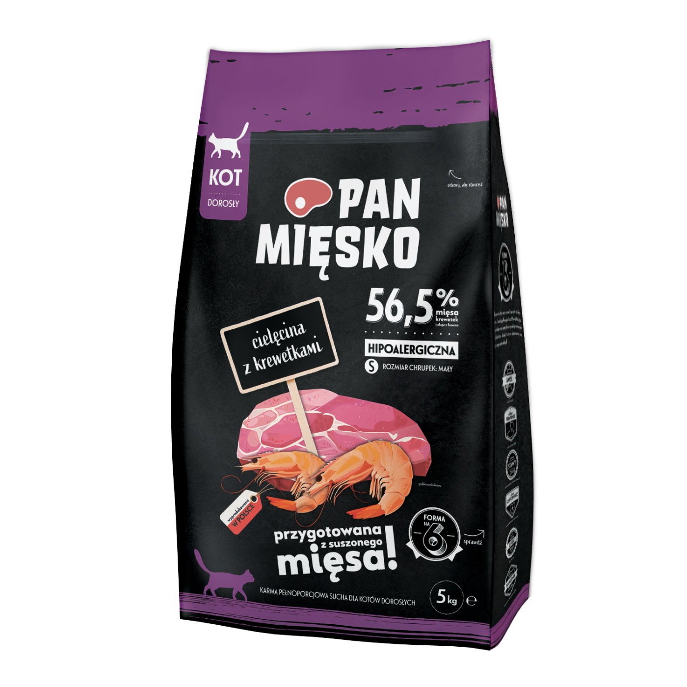 Hypoalergiczna karma sucha przeznaczona dla kotów dorosłych. Pan Mięsko to karma wyprodukowana w Polsce, która przygotowana jest ze starannie wyselekcjonowanego, suszonego mięsa oraz dodatków w postaci polskich jabłek, warzyw i składników odżywczych, które zapewnią kotu wszystko, czego potrzebuje. Karma zawiera cielęcinę czyli lekkostrawne mięso o wysokiej zawartości białka i niskiej tłuszczu. Podawanie tego produktu zapewnia dostarczenie niezbędnych witamin do prawidłowego funkcjonowania organizmu. Jest również doskonałym źródłem żelaza. Krewetki natomiast są bogate w sód, potas, żelazo, magnez, cynk, fosfor, fluor, selen, jod, miedź, a nawet kwasy tłuszczowe omega-3 i omega-6.
