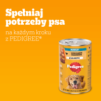 100 g karmy mokrej można zastąpić około 20 g karmy suchej PEDIGREE®. Należy uwzględnić kalorie pochodzące z przysmaków. Zapewnij świeżą wodę do picia. Podawać o temperaturze pokojowej. Niewykorzystaną część przechowywać w lodówce do 2 dni.