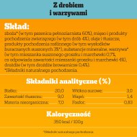 Zboża (pszenica pełnoziarnista 60%), mięso i produkty pochodzenia zwierzęcego (drób 4%), oleje i tłuszcze, produkty pochodzenia roślinnego (wysłodki buraczane 3%), warzywa (mieszanka groszku i marchewki 4%), drożdże (0,4%), substancje mineralne.