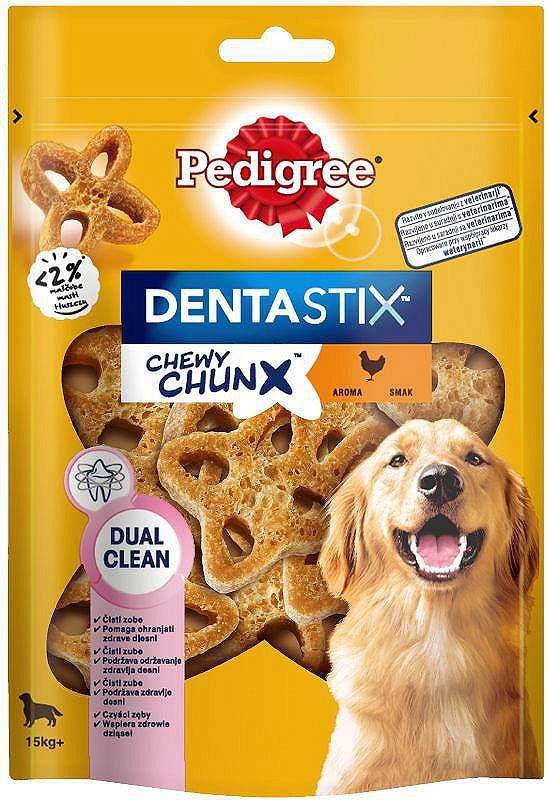 Pedigree Dentastix™ Chewy ChunX™ nie tylko świetnie smakuje, ale również wspiera pielęgnację zębów Twojego pupila. Dzięki zawartym w tej przekąsce dla psów dorosłych ras średnich i dużych aktywnym składnikom, każdy kęs pomaga skutecznie czyścić zęby, a innowacyjny kształt wzmacnia efekt ścierania osadu podczas żucia. Dentastix™ Chewy ChunX™ wyróżnia niska zawartość tłuszczu (mniej niż 2% tłuszczu). Nie znajdziesz w nich sztucznych barwników, dodatków smakowych i cukru.