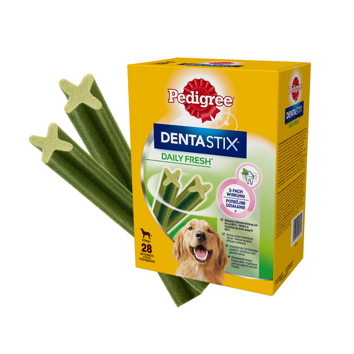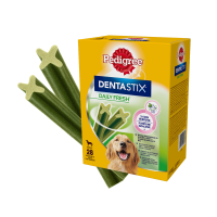 PEDIGREE® DentaStix™ Daily Fresh to karma uzupełniająca dla psów powyżej 4. miesiąca życia. Dzięki składnikom aktywnym i unikalnej mieszance z ekstraktu z zielonej herbaty i olejku eukaliptusowego odświeży oddech Twojego pupila. Podawaj codziennie swojemu psu pyszny i skuteczny przysmak dentystyczny PEDIGREE® DENTASTIX™ Daily Fresh, aby mógł zachować zdrowe i silne dziąsła. Przysmaki nie zawierają cukrów, sztucznych barwników i dodatków smakowych. Przeznaczone są wyłącznie dla zwierząt o masie ciała powyżej 25 kg.