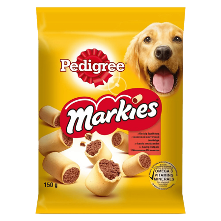Pedigree Markies to przysmak dla dorosłych psów, który jest chrupiący i bardzo smakowity a to za sprawą smacznego nadzienia. Przysmaki te można turlać, rzucać i łapać i dzięki temu zapewnić psu pyszną zabawę. Pedigree Markies są wzbogacone o kwasy tłuszczowe Omega-3, witaminy i minerały, a do tego nie zawierają sztucznych barwników. Podając psu ten przysmak dbasz o jego dobre samopoczucie.