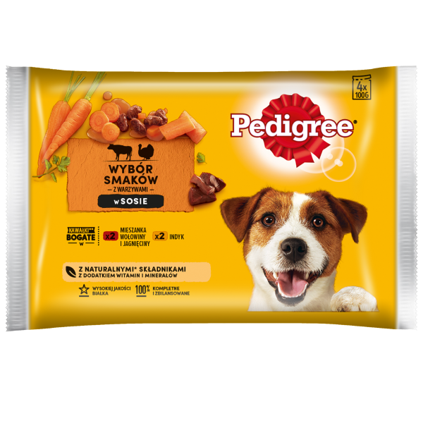 Pedigree Mokra Karma Dla Dorosłych Psów W Sosie (Z Wołowiną I Jagnięciną, Z Indykiem I Marchewką) 4x100g - Opis Produktu