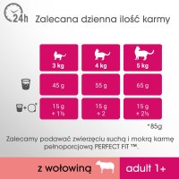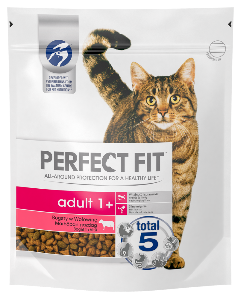 Perfect Fit Adult 1+ został opracowany z udziałem lekarzy weterynarii i specjalistów ds. żywienia z Centrum Żywienia Zwierząt Domowych WALTHAM. To pyszny posiłek dla kotów aktywnych powyżej 1 roku życia, który zawiera unikalną formułę Total 5, zapewniającą Twojemu kotu ochronę zdrowia, jakiej potrzebuje na co dzień. Ale Perfect Fit to nie tylko formuła Total 5 - wariant bogaty w wołowinę dostarcza 3 dodatkowe benefity, które są powiązane ze zdrowiem i trybem życia Twojego kota. Z tym pokarmem, dopasowanym do jego specyficznych potrzeb masz pewność, że pupil dostaje odpowiednie dla siebie pożywienie.