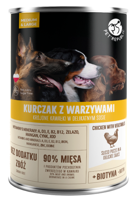 PetRepublic kawałki w sosie z kurczakiem i warzywami 800 g to karma pełnoporcjowa dla dorosłych psów wszystkich ras.