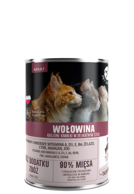 Krojone kawałki wołowiny dla kotów dorosłych, serwowane w delikatnym sosie stanowiącym zaproszenie do pysznego posiłku. 90% mięsa i produktów pochodzenia zwierzęcego w kawałku.