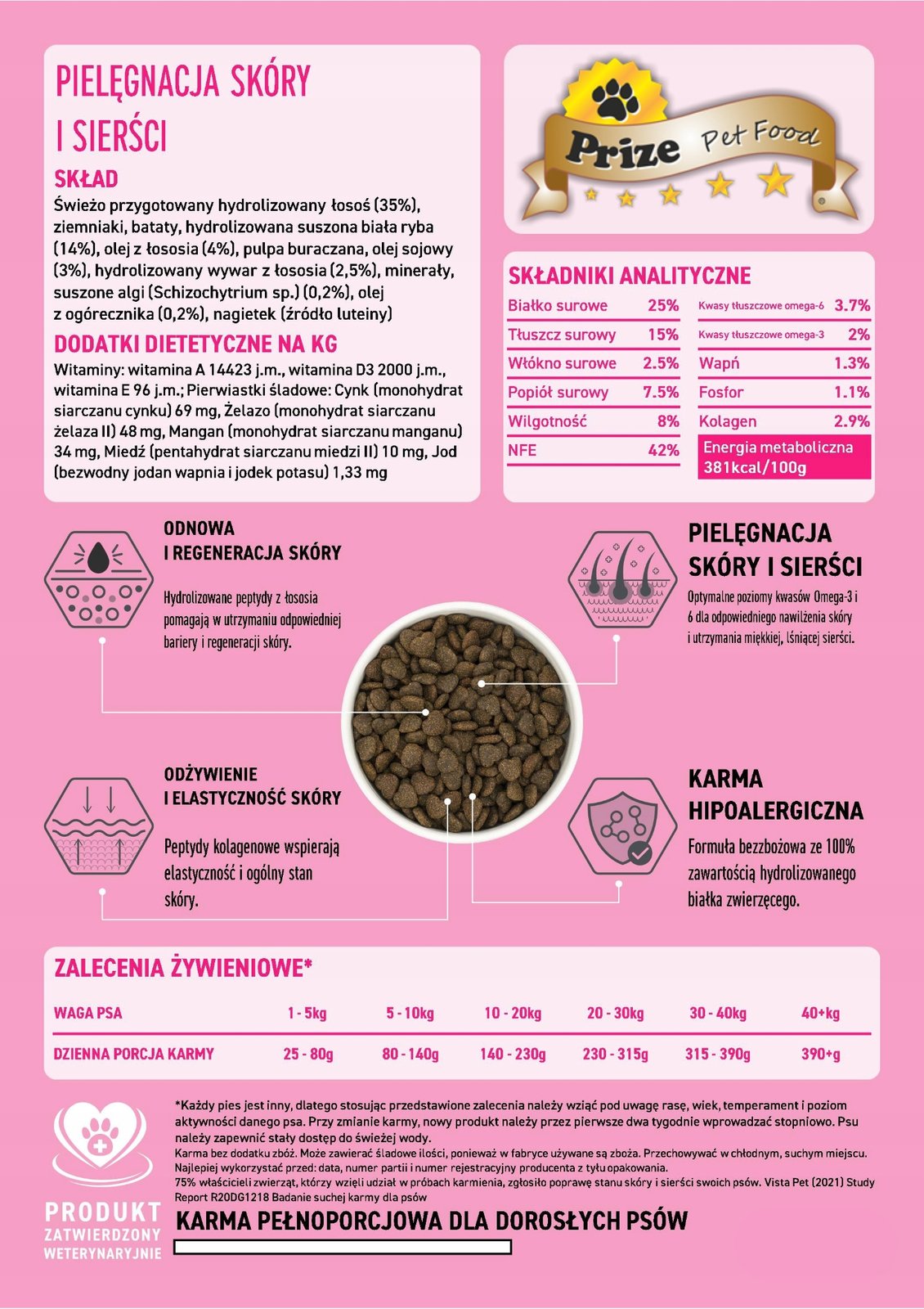 Białko 25%, Tłuszcz 15%, Omega-6 3,7%, Omega-3 2%, Kolagen 2,9%