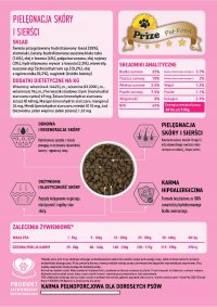 Karma Prize Peptide+ to kompletne, hipoalergiczne pożywienie dla dorosłych psów wszystkich ras z problemami dermatologicznymi, wrażliwym układem pokarmowym oraz skłonnością do alergii. Formuła oparta na hydrolizowanych peptydach rybnych, kolagenie, olejach Omega-3 i Omega-6 oraz naturalnych składnikach roślinnych wspiera odbudowę skóry, elastyczność tkanek oraz zdrowy połysk sierści.