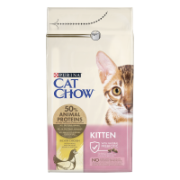 Purina Cat Chow Kitten Bogata w Kurczaka to pełnoporcjowa karma sucha stworzona z myślą o kociętach do 12 miesiąca życia oraz kotkach ciężarnych i karmiących. Zawiera 50% białka pochodzenia zwierzęcego (w tym 14% kurczaka), co wspiera prawidłowy rozwój mięśni i ogólne zdrowie młodych kotów.