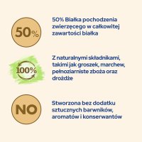 Karma wzbogacona jest w DHA, naturalnie obecne w mleku matki, wspomagające rozwój mózgu i wzroku kociąt. Składniki roślinne, takie jak pełnoziarniste zboża, marchew, groszek, cykoria i drożdże, tworzą zbilansowaną recepturę, a prebiotyki wspierają zdrowe trawienie.