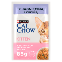 PURINA CAT CHOW Kitten, delikatne kawałki w sosie z jagnięciną i cukinią dla kociąt. Pełnoporcjowa karma dla młodych kotów po sterylizacji. Odpowiednia także dla kociąt oraz kotek ciężarnych i karmiących.