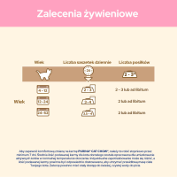 Podawaj 2-3 posiłki dziennie lub według uznania w temperaturze pokojowej: 6-12 tydzień życia: od 1 do 4 saszetek; 12-26 tydzień życia: od 2 do 5 saszetek; 26-52 tydzień życia: od 5 do 3 saszetek. Każdy kot ma inne potrzeby, które są zależne od jego poziomu aktywności oraz kondycji ciała, dlatego ilość podawanego jedzenia oraz pory posiłków wymagają indywidualnego dostosowania.