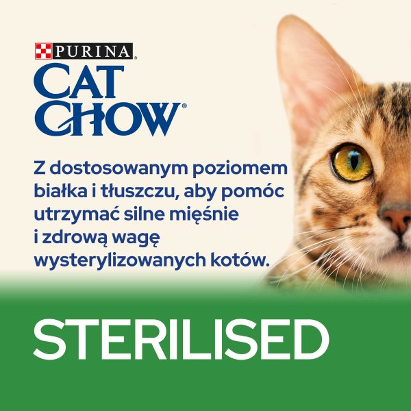 Purina Cat Chow Special Care Sterilised została specjalnie opracowana, aby pomóc równoważyć wpływ zmian hormonalnych związanych z zabiegiem sterylizacji. Zbilansowany poziom białka i tłuszczu w karmie pomaga zachować silne mięśnie oraz utrzymać prawidłową wagę dorosłego kota. Karma bogata jest w kurczaka oraz zawiera wszystkie składniki odżywcze niezbędne do zachowania zdrowia kotów po sterylizacji lub kastracji.